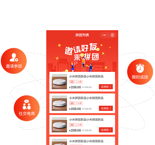 基于微信社交开展拼团,依靠朋友圈的飞速传播,提升品牌影响力,促进消费者分享带来商品销量,商城订单成倍提升,增加收益。